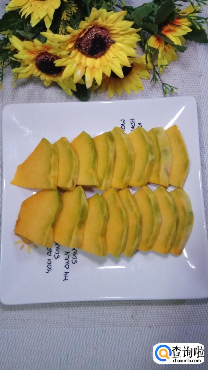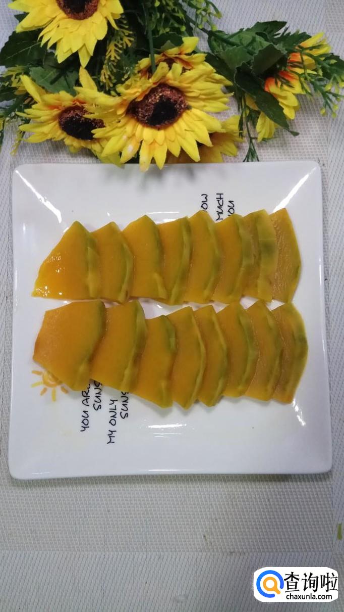 准备适量南瓜,先去皮后切成薄片,放在盘中备用。注意,摆放得要整齐一些,这样更加好看。