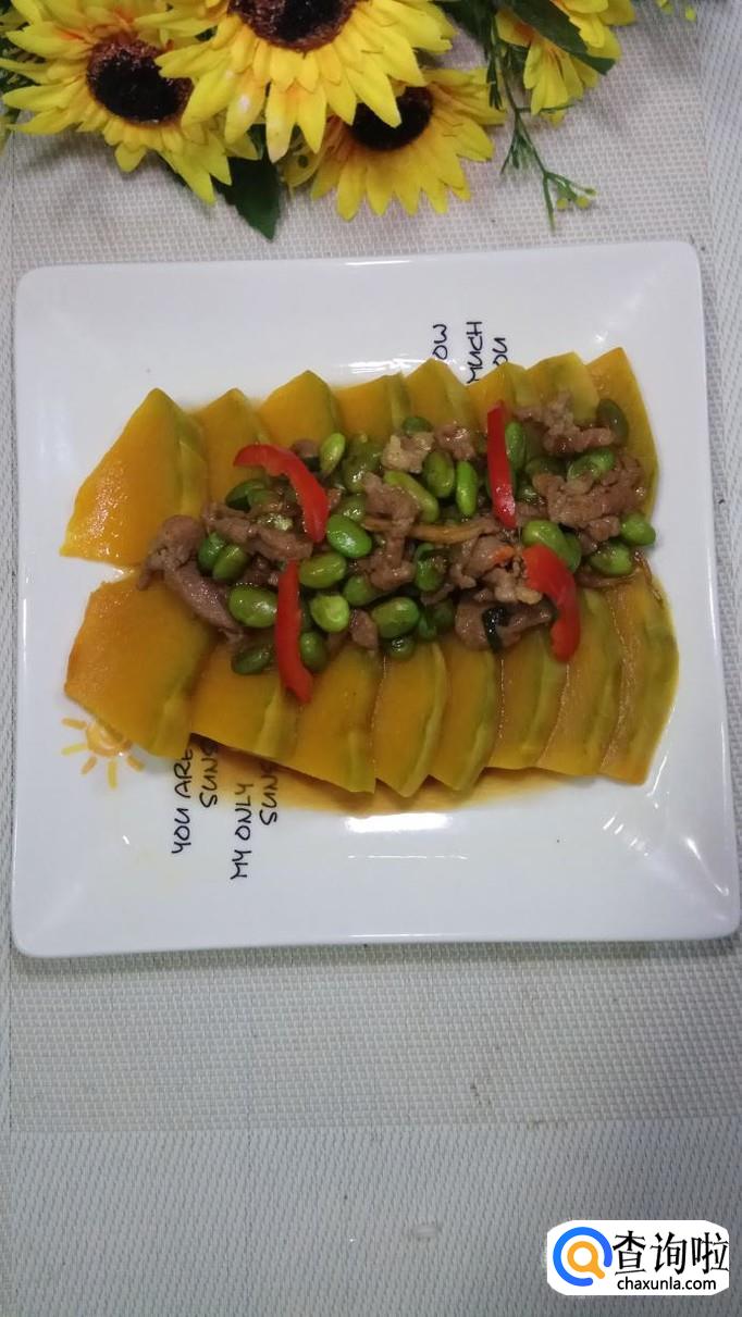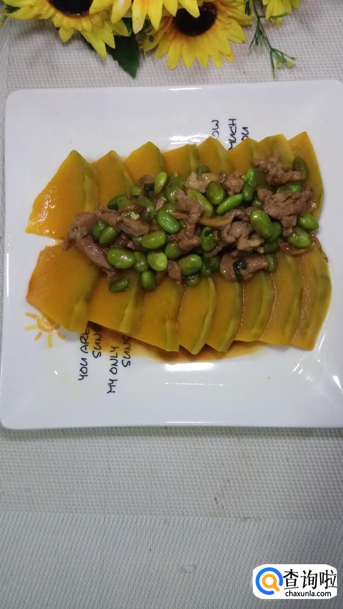 将炒好的毛豆肉丝浇在南瓜上面,趁热就可以吃了,喜欢辣的还可以切少许红椒丝放在上面,真的特别美味。