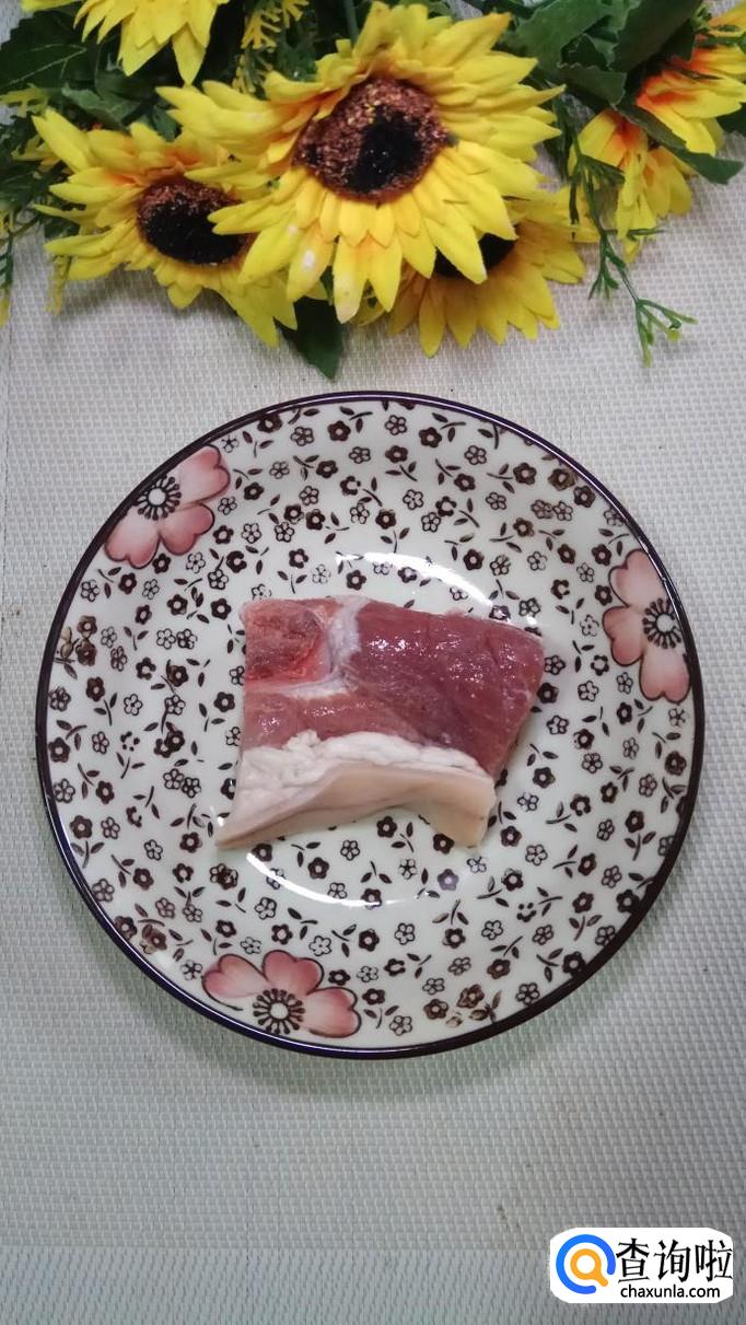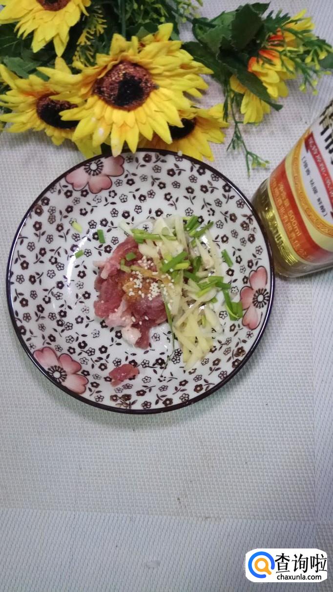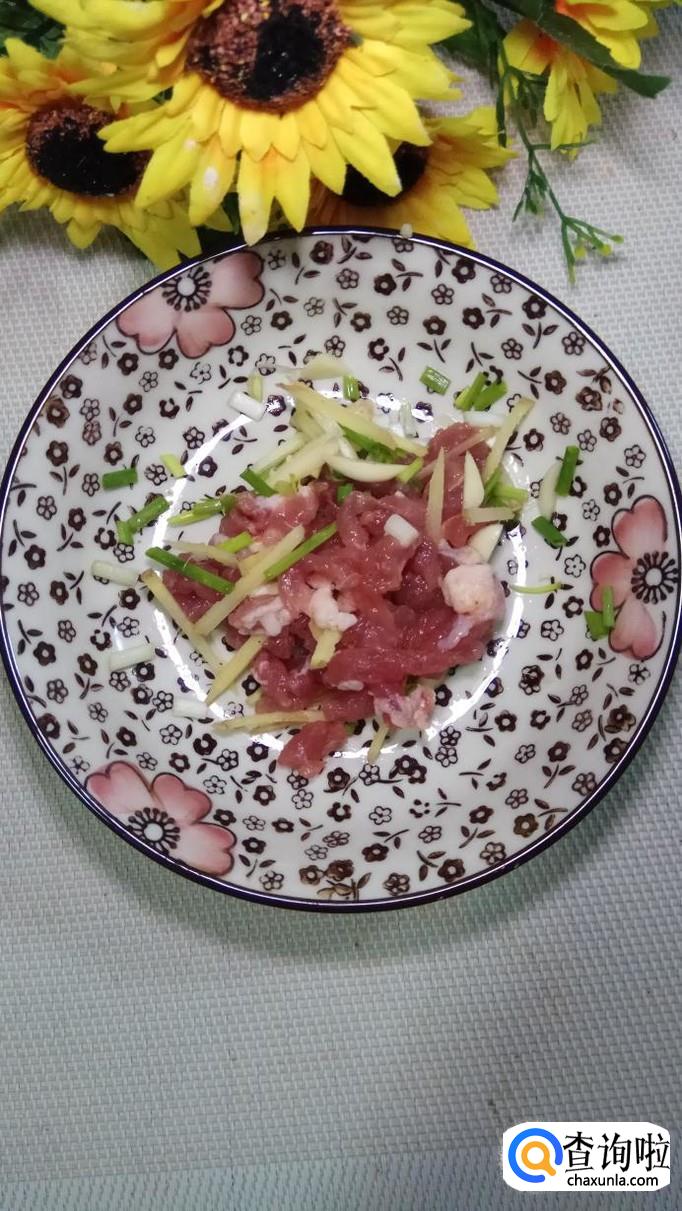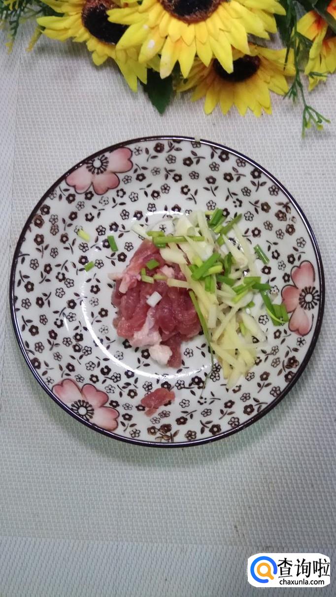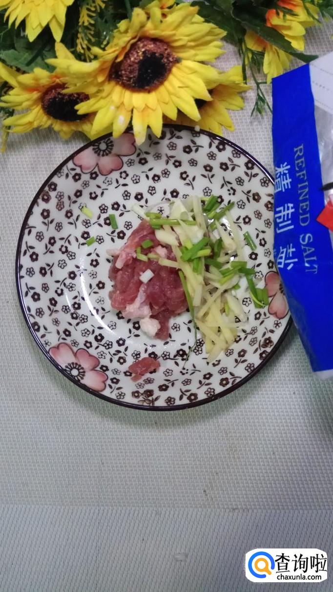 准备适量五花肉,将五花肉切成肉丝,再准备适量葱姜蒜,切碎后放在五花肉里。
