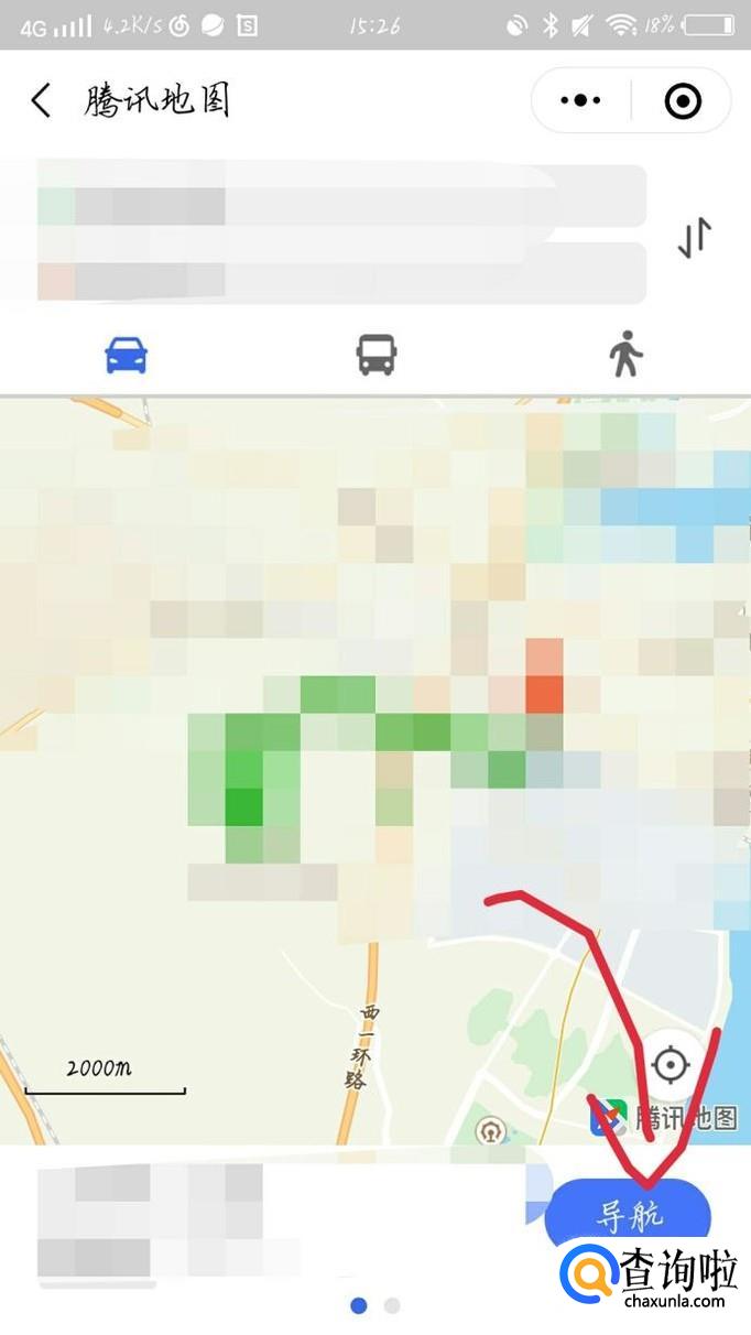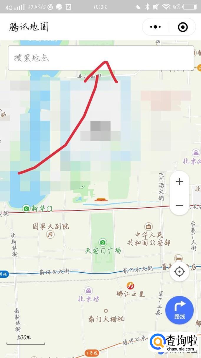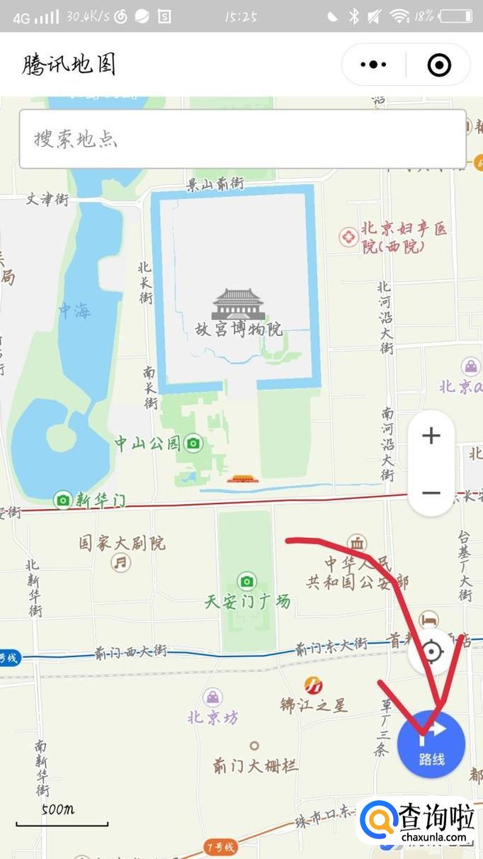 在“搜索地点”中输入你的目的地,如图1箭头所示。会出现一个新的界面,点击右下角的“路线”选项,如图2箭头所示。