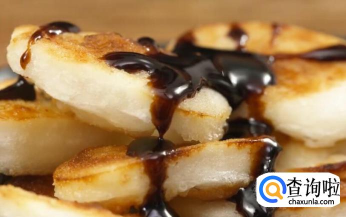 煎好的年糕趁热淋上红糖浆。