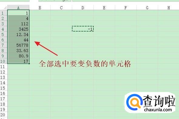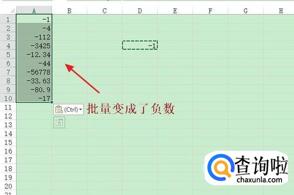 点击对话框的确定,返回到Excel表格,我们就发现刚才A列的数字全部变成了负数(负数批量变正数的操作方法也一样)