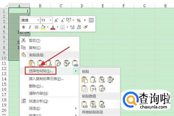 接下来我们全选打算变为负数的区域,比如A1到A10单元格,同样点击鼠标右键然后点击“选择性粘贴”,如图所示