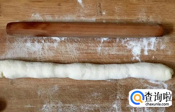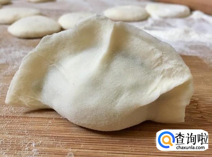 案板铺撒干面粉取一小块醒好的面团搓成长条,揪成小面剂子搓圆按扁后擀成饺子皮