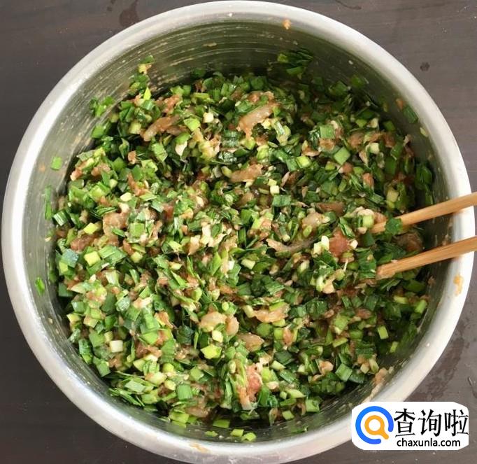 把切好的韭菜末放入腌制肉馅的容器中再次搅拌均匀即可