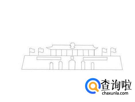 再在墙体的上面画出天安门上面的小旗子,并在画出天安门的第二层城楼,如图所示: