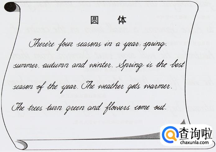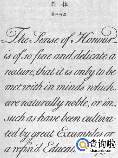 “圆体英文”是国内的一种说法,国外并没有与“圆体”相关的英文单词。因为国外英文书法的书写需要特定的工具(如羽毛笔、芦苇笔、斜蘸水笔等)所以国内早期学习英文书法的前辈将其进行改造,使之可以用普通钢笔即可书写,并且快速而且某些地方也符合中国的书写习惯。