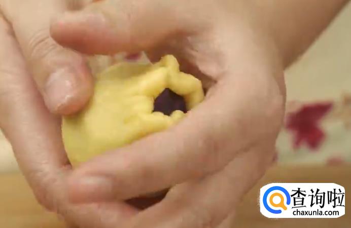 之后将静置好的面团取出,分成27克每个,再取一个擀扁放紫薯芝士酱。