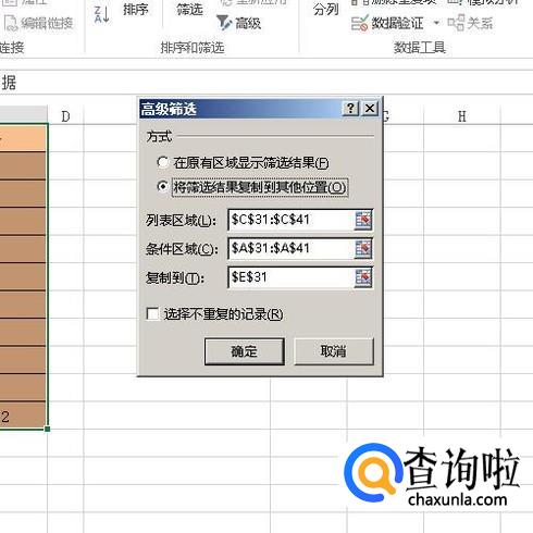 弹出一个对话框,在“方式”这里,点选第二项;“列表区域”已自动显示刚才选中的C31:C41;在条件区域这里输入A31:A41;选择复制到E31;再点确定。