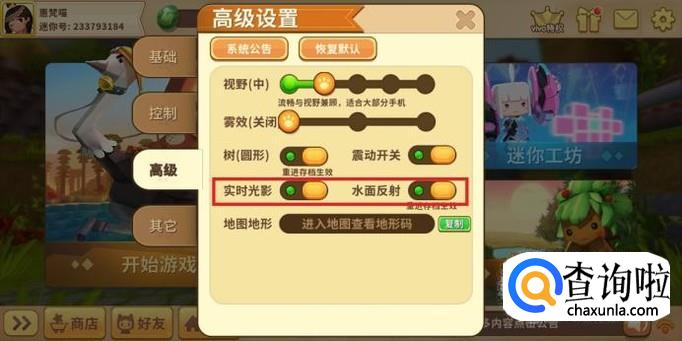 进入“高级设置”后,点击开启“实时光影”和“水面反射”,如图所示