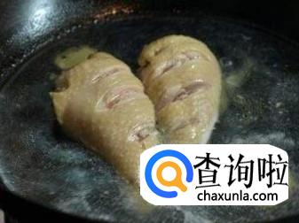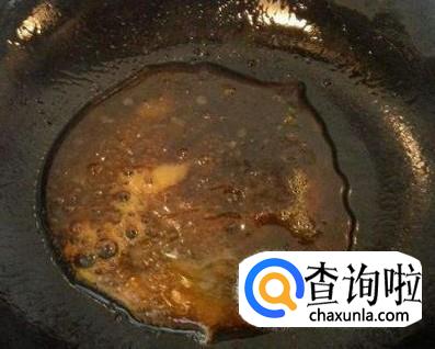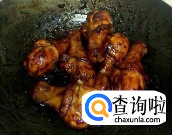 炒锅中放入适量的食用油,放入白糖,炒成酱红色时,将鸡腿放入锅中,用铲子快速翻炒,使鸡腿上色。