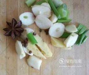 在锅中加入适量的酱油、盐、清水,将葱、姜、蒜、大料倒入锅中,大火烧开,然后转中火炖。