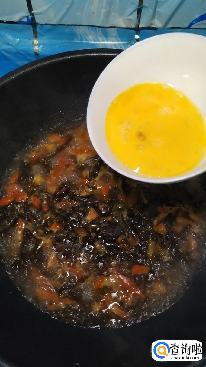 水烧开后转小火,熬10分钟左右,将打散的鸡蛋倒入锅中,等到鸡蛋全部飘起后,用勺子搅一下。