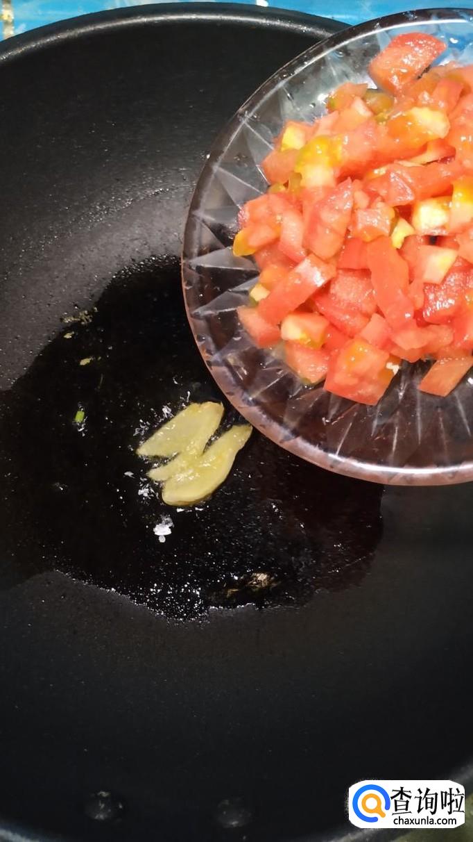 准备适量姜,洗净后切片,炒锅中放入适量油,油热后将姜片放入锅中炒香,然后将西红柿倒入锅中,炒至西红柿变软就可以了。