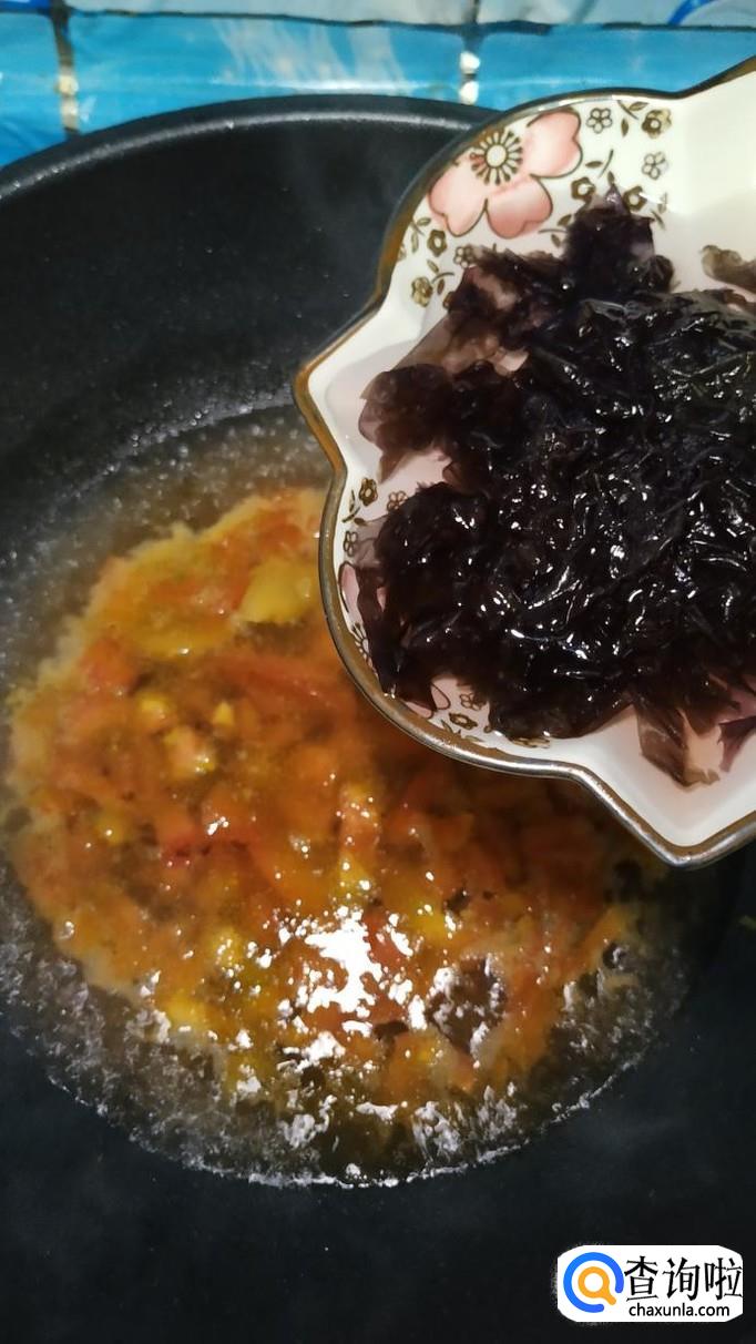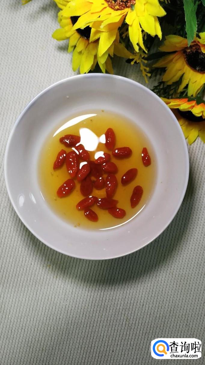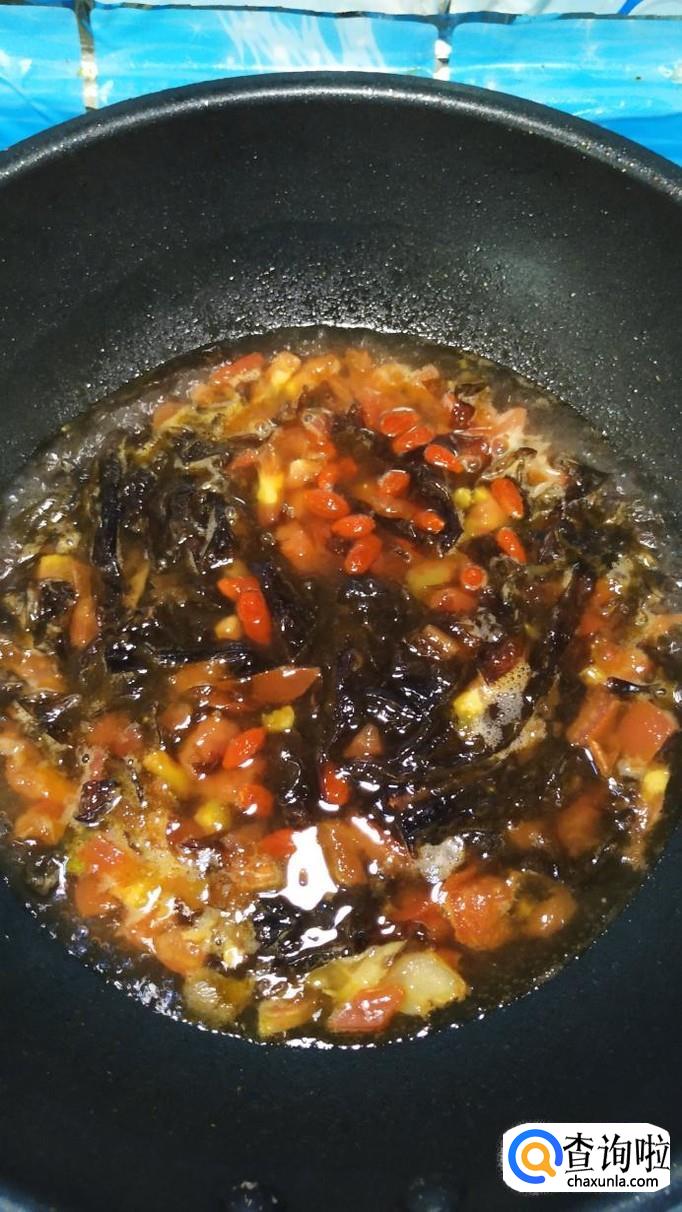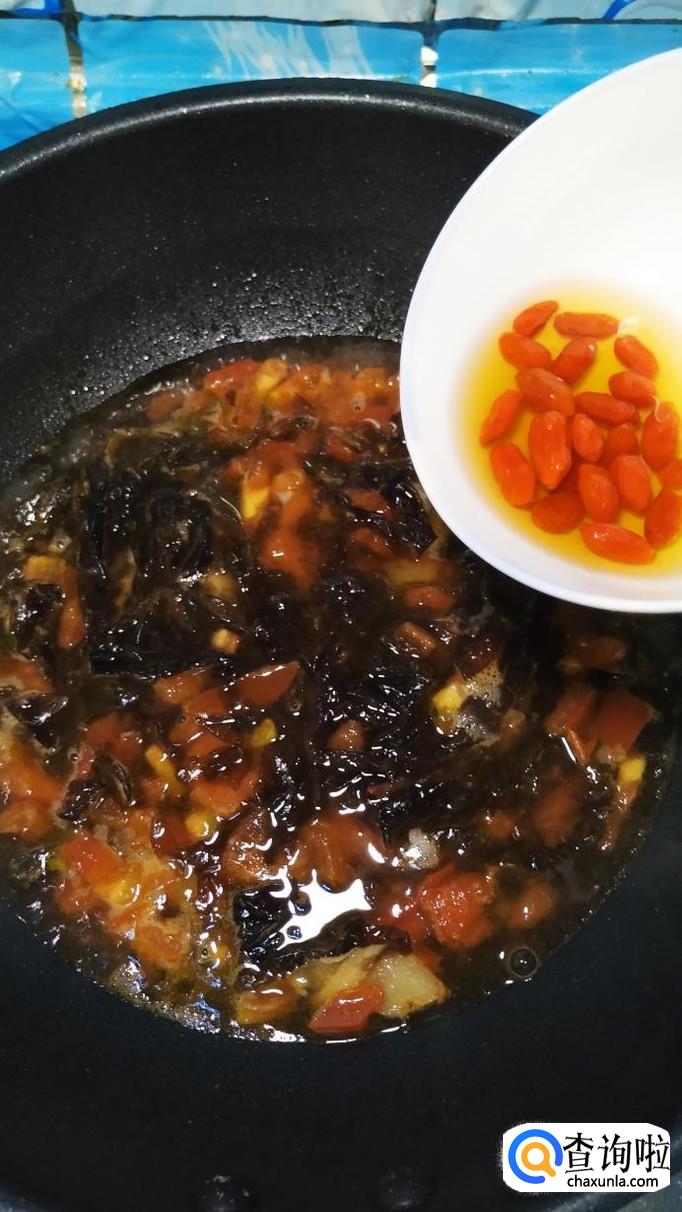 将之前泡好的枸杞,倒入锅中,和其他食材一起煮一下。