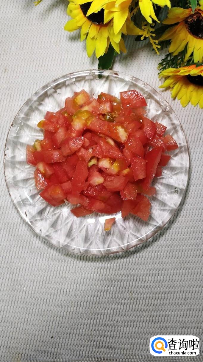 将鸡蛋打散,然后将西红柿切成丁,再准备适量枸杞子,提前用清水泡一下。