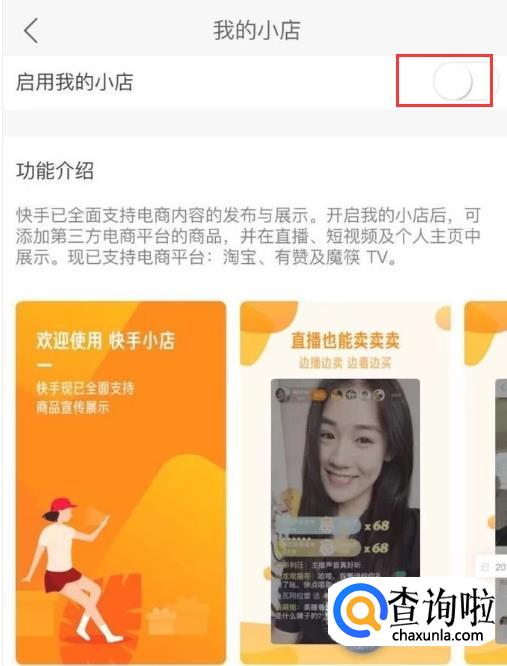 这时会弹出我的小店的页面,在页面中点击“启用我的小店”后面的开关,把其设置为开的状态。