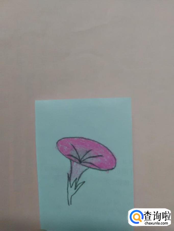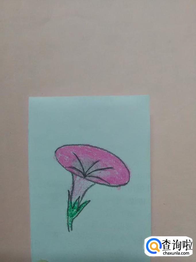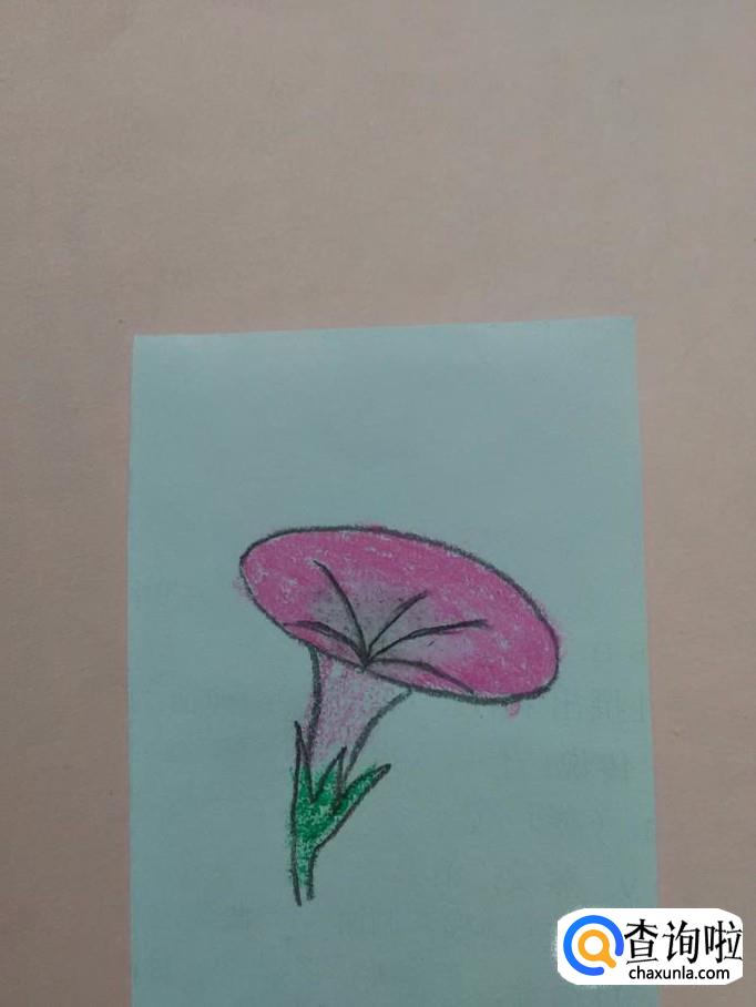 用油画棒画花朵,先画轮廓,画铺浅色,然后涂深色部分,最后涂花托,下面就开始画牵牛花。