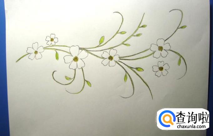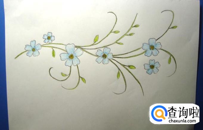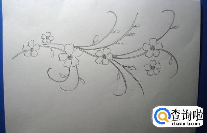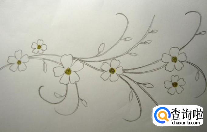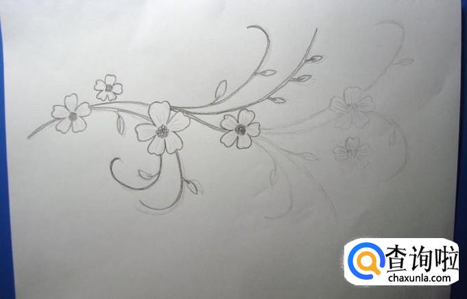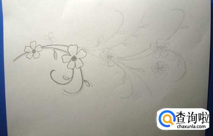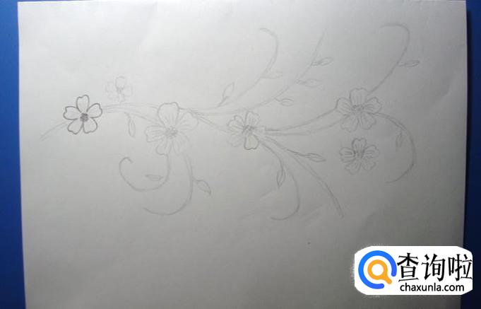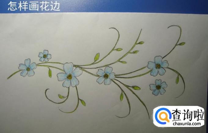 接着,用黑色彩铅笔画出花边的花朵,并画出连接的叶子图形,如下图所示。