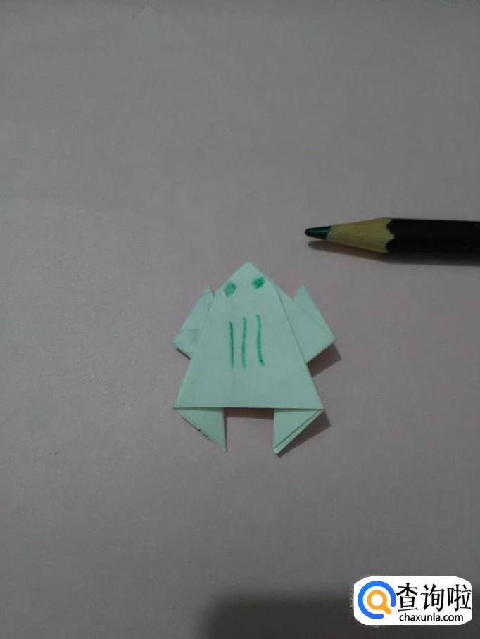 将纸反过来,用绿笔在上面画两个圆点,表示眼睛,在眼睛下面画三条竖线,表示背上的花纹,小青蛙就折好了。