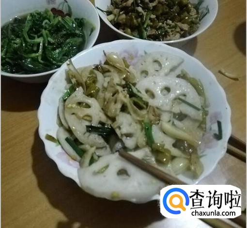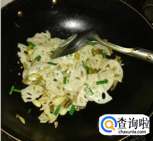 莲藕炒熟后,加入葱叶,翻炒到葱叶成熟。