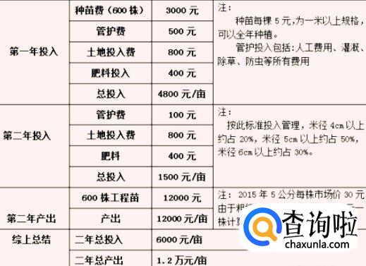 如果将泓森槐用于工程绿化等,那么两年的时间就可以将树木拿出来运用。也就是说如果你用两年的时间投入6000元每亩的泓森槐,那么两年以后,你的收益将达到1.2万元每亩。具体分析如下图所示。