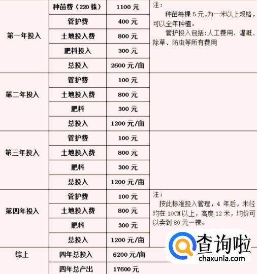 如果培养四年的泓森槐,树木可以用来作为建筑用材。也就是说你6200元每亩的投入,四年之后,你将获得1.7万元每亩的收益。具体分析如下图所示。