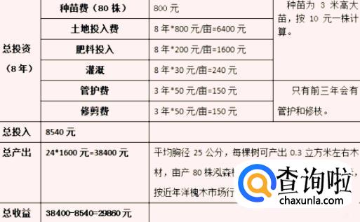 再来,如果培养八年的泓森槐,树木可以直接作为家具、木地板等用材。也就是说你六千多每亩的投入,八年之后,你将获得将近3万元每亩的收益。具体分析如下图所示。