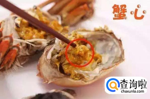 蟹心 蟹心长在蟹肉和蟹黄的中间位置,同时与蟹胃相连,食蟹黄的时候极易连蟹心一起食下,蟹心是寄生虫寄生的主要区域之一,而且性味极寒,不能食用