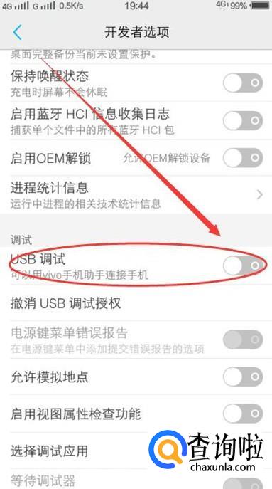 最后找到图示的USB调试,将这个按钮调制开启状态,我们的手机就能通过数据线和电脑连接了,这时候就可以进行想要的操作了。