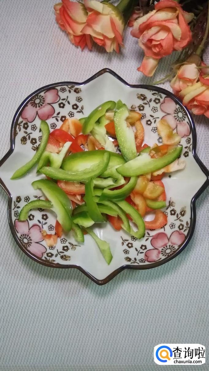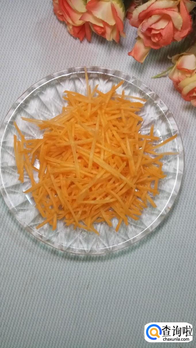 将焯好水的胡萝卜,咸菜,海带,用凉水过一下,沥干水分,放入盘中备用,再放入少许的青椒丝和红椒丝。