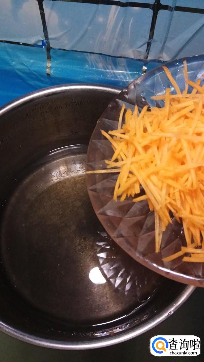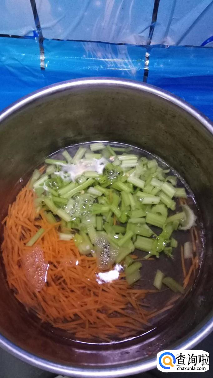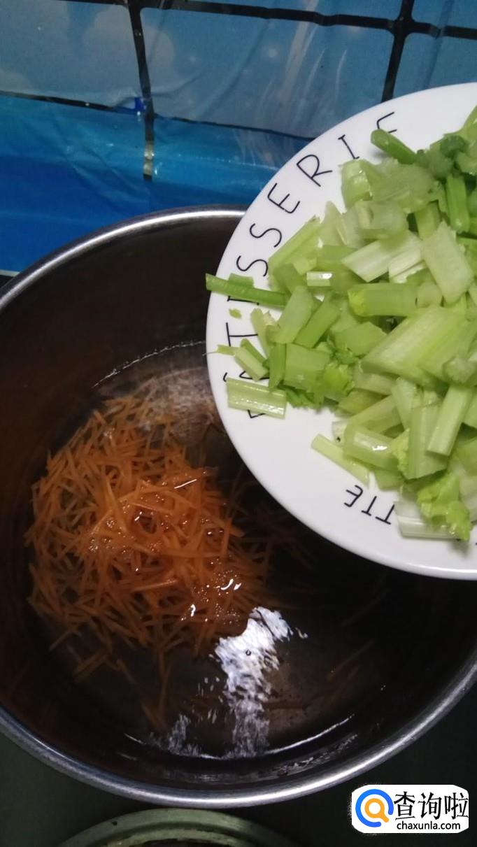 锅中烧开水,水开后,将胡萝卜丝,芹菜放入锅中焯水,这些菜比较容易熟,水开后十秒钟就可以捞出来。