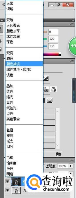 再在右边上的图层里的“正常”改为“颜色减淡”,就会出现像白色一样的样子。