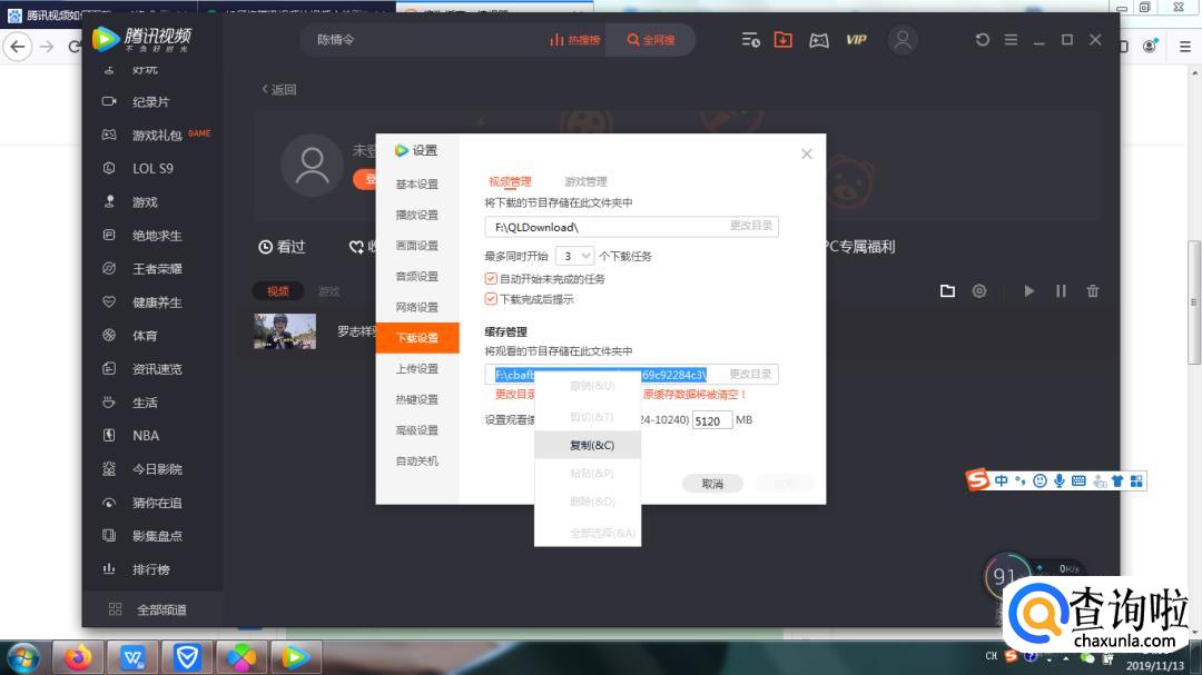 选择下载设置,查看视频播放缓存记录的“存储位置”,右键点击复制。