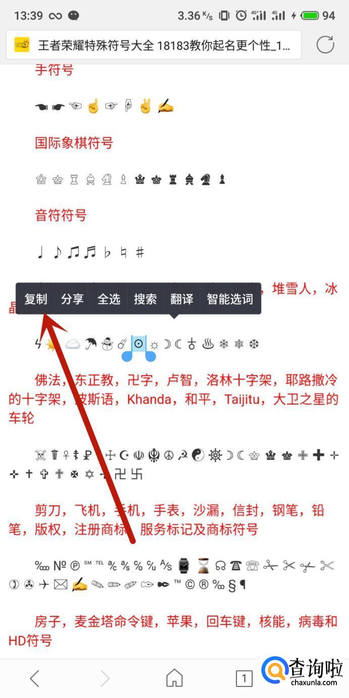 进入之后,找到想要打出来的符号,长按并将其选中,点击“复制”。
