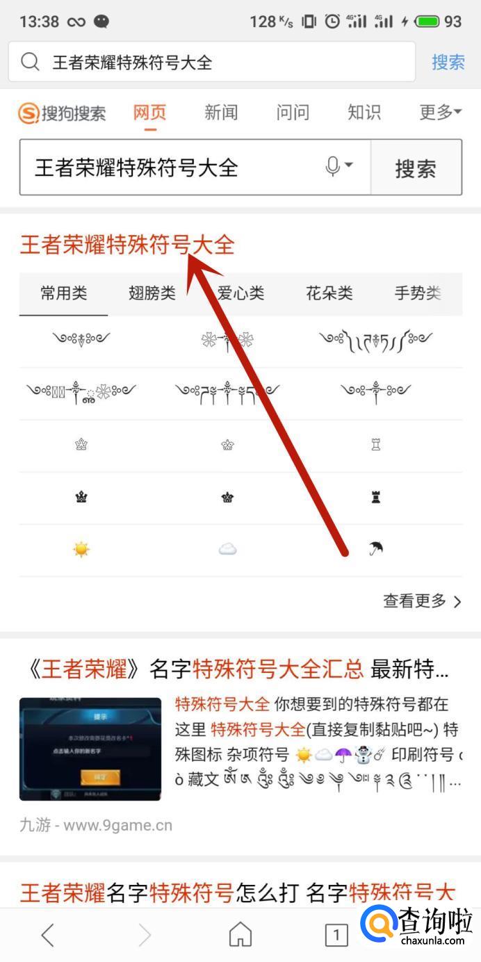 进入搜狗浏览器搜索“王者荣耀符号大全”,点击并进入,如图所示。