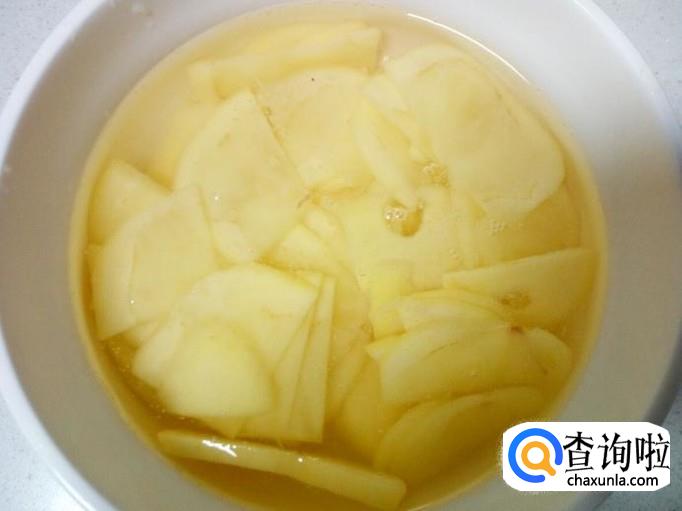 土豆去皮,用水清洗干净,控干水分,切成片。放入水中浸泡一下,去除淀粉成分,然后再用水投几遍,控干水分。