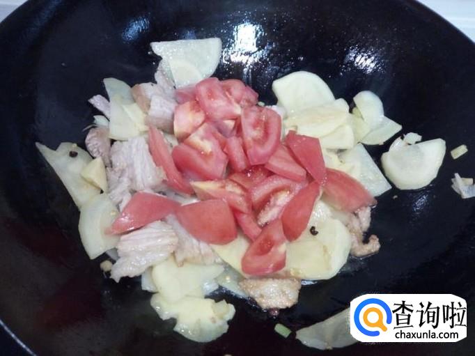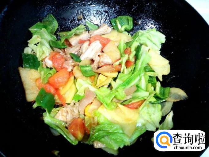 土豆片炒至五分熟,放入西红柿翻炒。炒至西红柿变软,放入卷心菜翻炒,放入少许蚝油,盐。