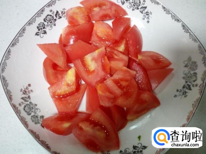 西红柿用水清洗干净,控干水分,切成块。