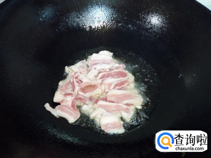 锅里放入油加热,油热后放入花椒爆锅。放入肉片翻炒。
