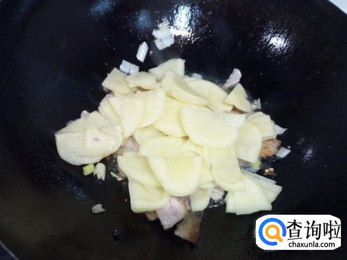 炒至肉片下油,颜色微白,放入料酒,少许酱油,葱,姜,翻炒。随即放入土豆片翻炒。