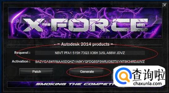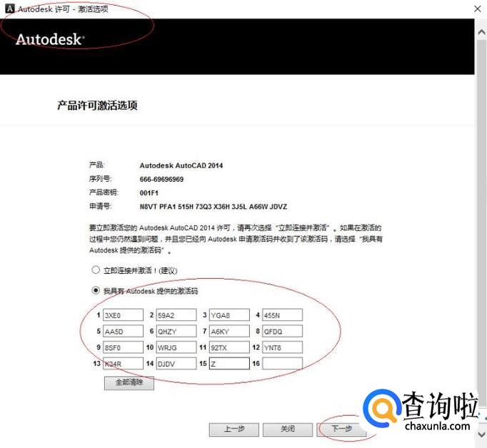 如图所示,运算AutoCAD 2014软件注册码。输入AutoCAD 2014软件注册码,点击"下一步"按钮。