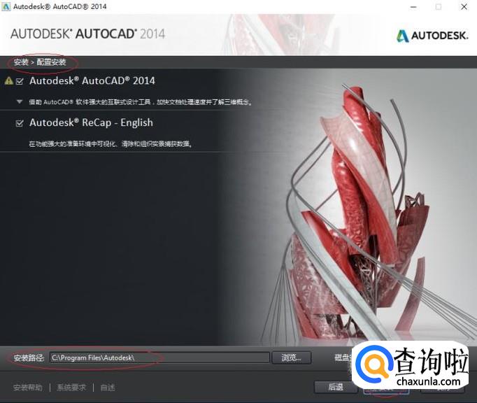 如图所示,点击"安装路径→浏览..."按钮。选择AutoCAD 2014安装路径,设置完成点击"安装"按钮。