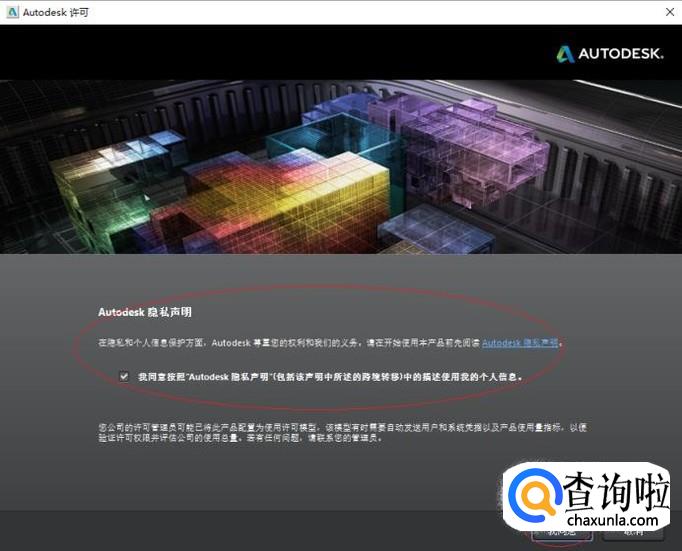 如图所示,选择国家或地区。勾选"接受Autodesk许可及服务协议"单选框,设置完成点击"下一步"按钮。