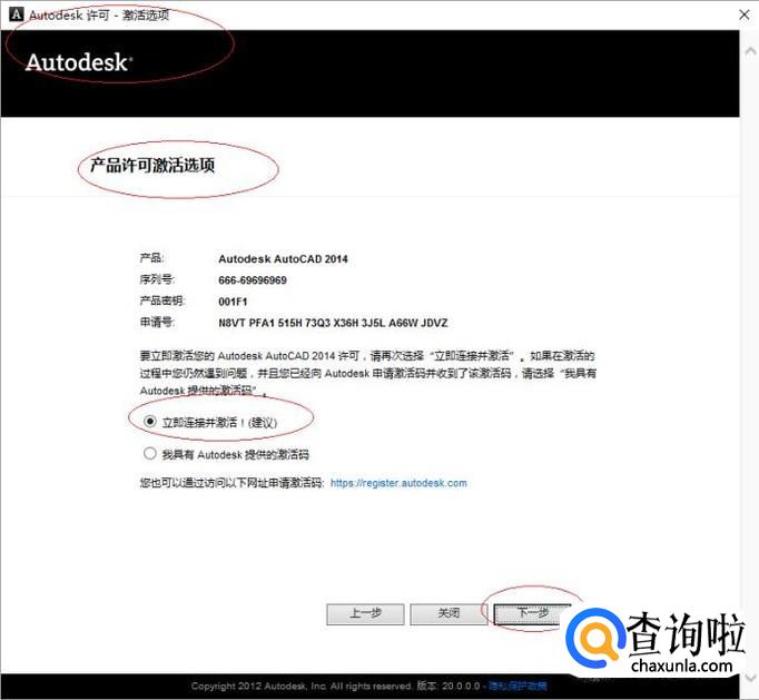如图所示,选择AutoCAD 2014产品许可激活选项。勾选"立即连接并激活"单选框,设置完成点击"下一步"按钮。
