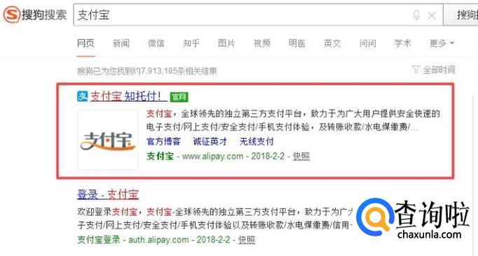 这种情况下我们只能使用网页版支付宝来注册新支付宝账号了。首先打开搜狗浏览器,搜索“支付宝”,可以看到一个有“官方”后缀的网站,点击进入。