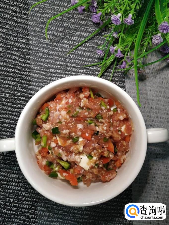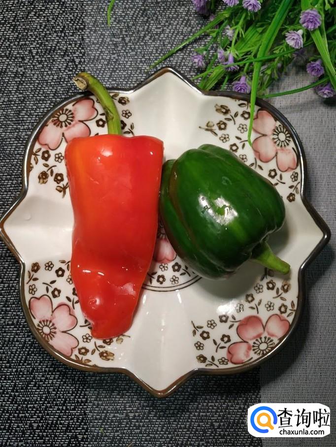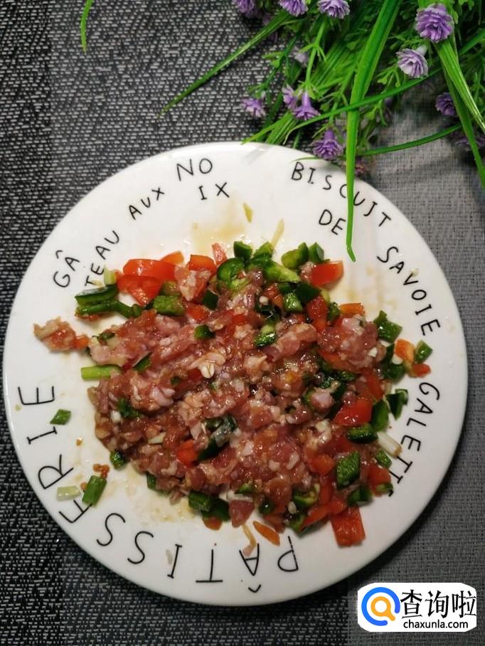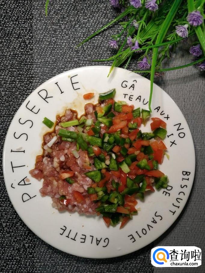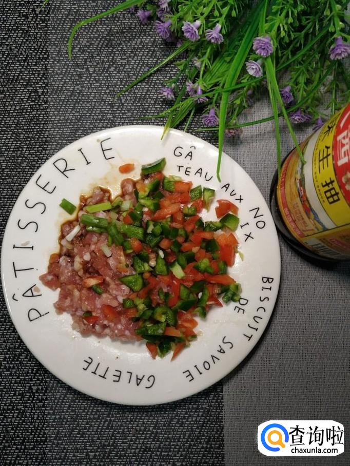 准备适量红椒和青椒,将它们洗净后,取出适量,切成丁儿,和五花肉末放在一起。