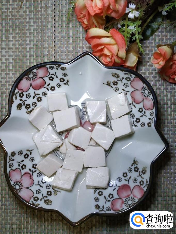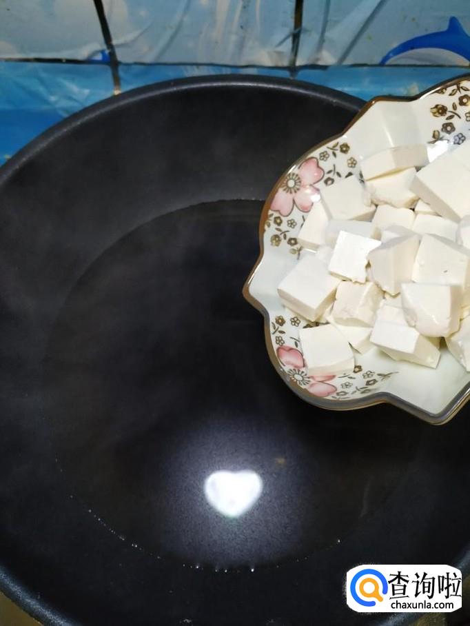 准备适量嫩豆腐,洗净后切块,放入锅中焯水,然后捞出,放在一个比较深的容器中,因为蒸熟之后,有可能会出水,容器深一点比较好。