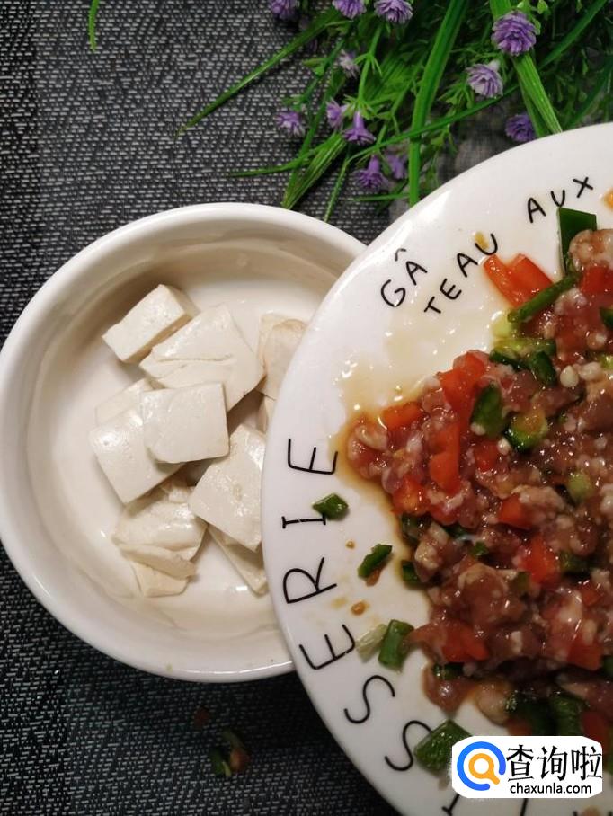 肉末适量豆腐适量,红椒适量,青椒适量,生抽适量,盐适量,淀粉适量,鸡精适量,五香粉适量,料酒适量。