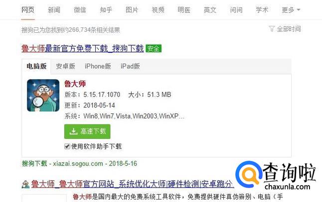 首先搜狗搜索鲁大师,点击首页第一个进入官网,下载鲁大师,如图所示。